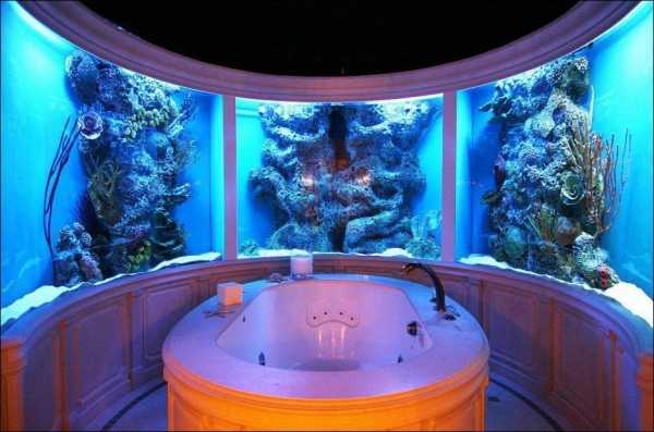 Невероятно привлекательная идея для ванной комнаты: стены-аквариумы создают впечатление, будто не просто принимаешь ванну, а погружаешься на дно океана.