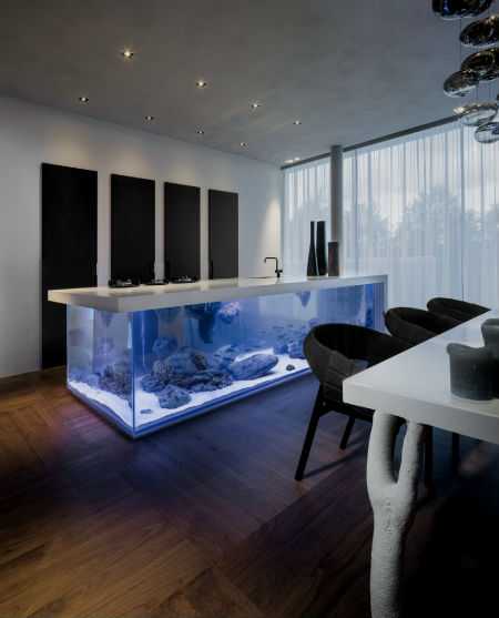 Возьмем к примеру Роберта Коленика и его проект Ocean Kitchen, который наделал много шума несколько лет назад. Этот невероятный островной кухонный стол не только практичен, но и красив, ведь это стол-аквариум. Какое грамотное использование пространства! Согласитесь, кухня, на которой размещен такой огромный островной стол, включающий вместительный аквариум, едва ли требует чего-либо еще в плане декора. Кормление рыбы может показаться сложным, но на самом деле столешница поднимается простым нажатием кнопки, что обеспечивает доступ для совершения всех необходимых манипуляций.