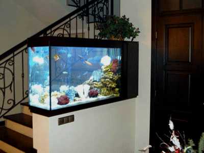 Встроенный аквариум требует планирования еще на этапе создания дизайн-проекта, чтобы заранее определить, с какой стороны будет производиться обслуживание, какими обитателями его заселить. Если резервуар находится между комнатами, где не требуется прозрачность, его заселяют густыми водорослями.