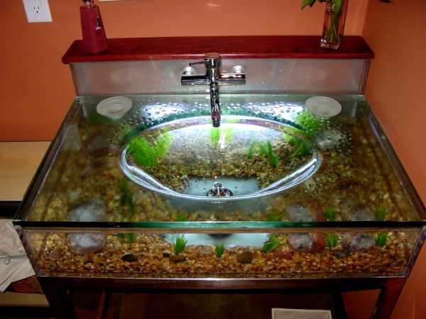 Еще одна свежая идея – раковина в ванную комнату, выполненная из прочного стекла, наполненная водой и заселенная рыбками.