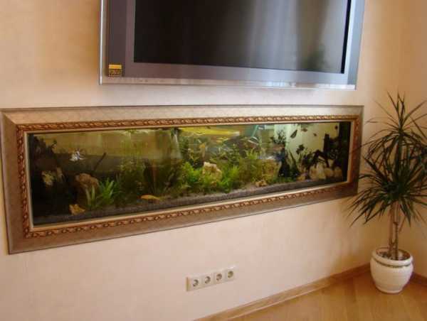 Желание наполнить жилище экзотикой приводит к неожиданным решениям. Можно приобрести специальную тумбу для размещения большого аквариума, но это выглядит громоздко, требует дефицитного места. Отличным вариантом будут аквариумы, встроенные в стены и мебель.
