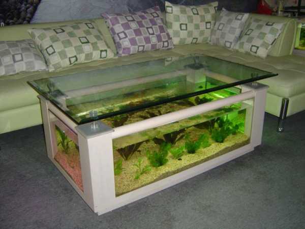 Очень привлекательно смотрится журнальный столик, одновременно играющий роль аквариума.