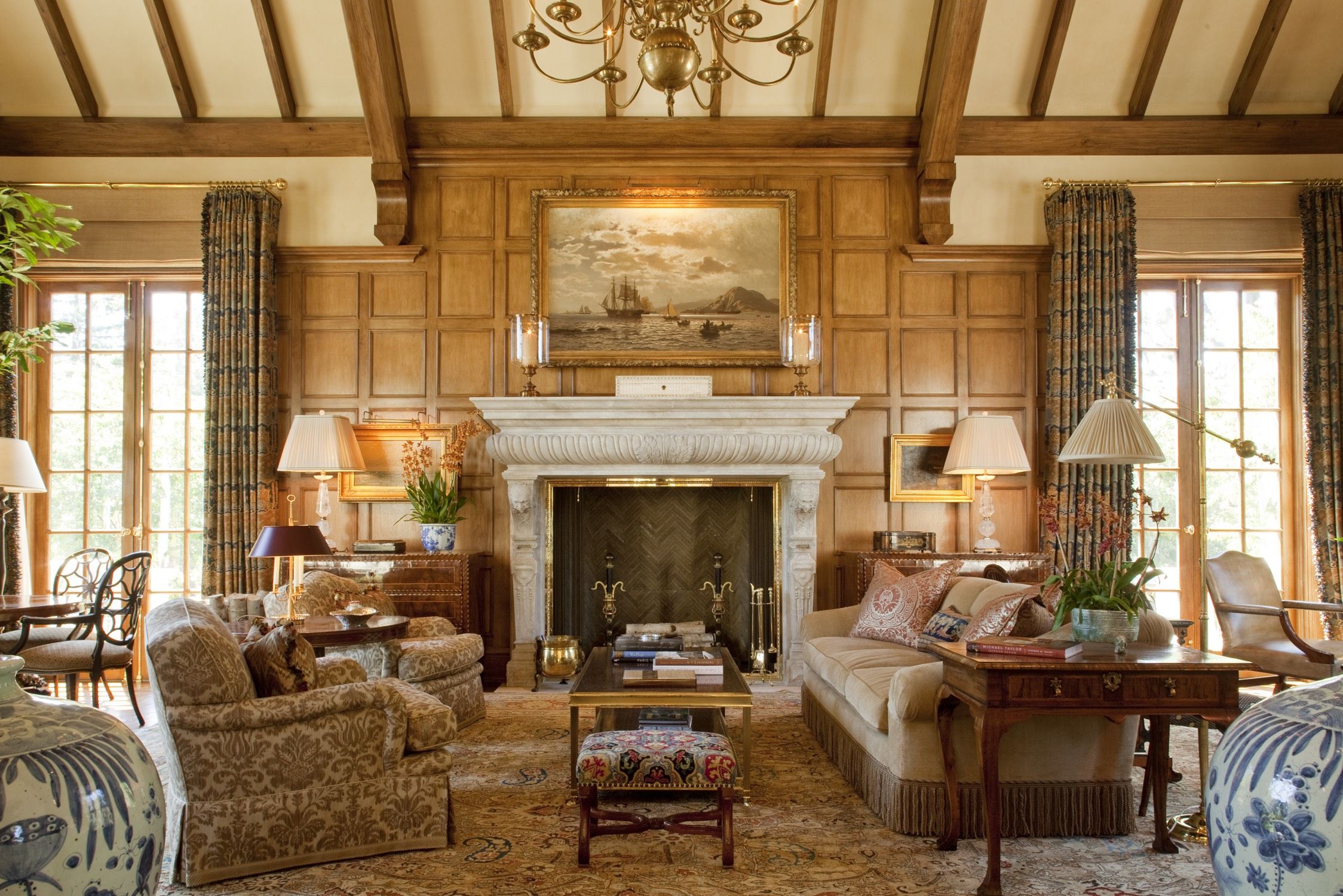 Гостиная с камином в стиле английского кантри, дизайнер Suzanne Kasler