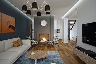 Основное освещение организуется малозаметными точечными светильниками, их дополняют оригинальным решением, на котором делается акцент. Например, композицией из ярких торшеров идентичной формы, но разной величины или инсталляцией из светильников, имитирующих макет солнечной системы в центре комнаты. В помещении, объединяющем сразу несколько зон можно разместить несколько ярких торшеров разных цветов и размеров, «разбросав» их по всему пространству.