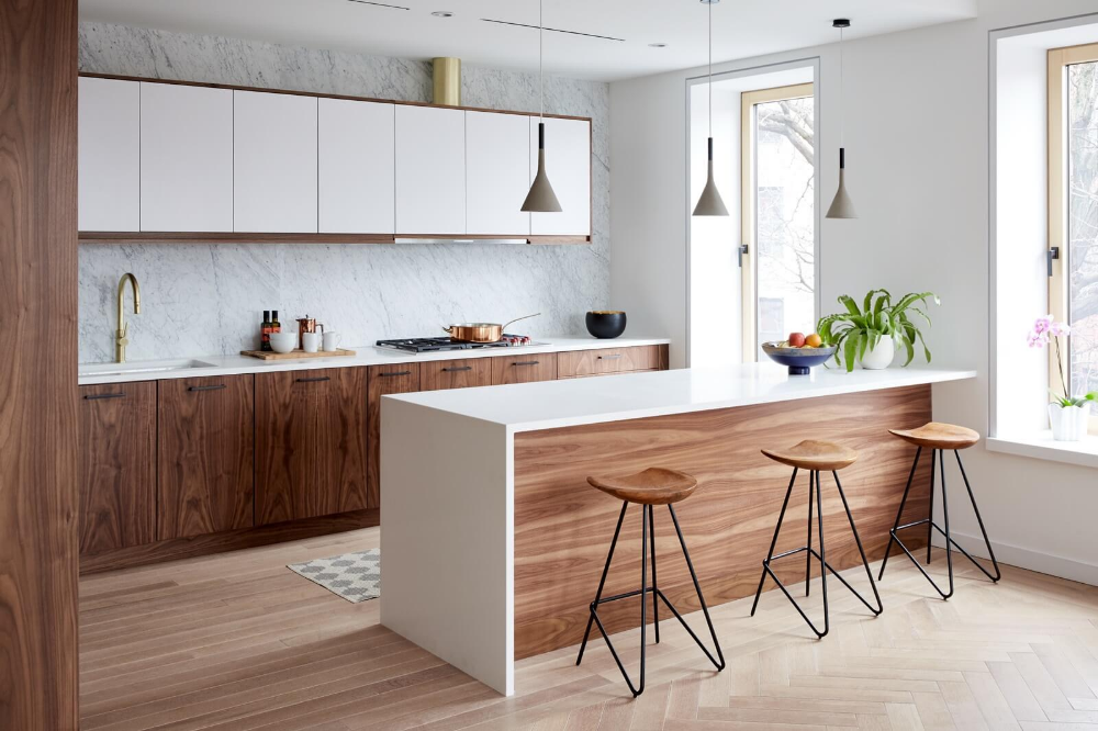 Барная стойка также может служить своего рода перегородкой, отделяющей кухню от остального пространства. Приподнятая верхняя часть также позволяет семье и гостям взаимодействовать с поваром, фактически не находясь в рабочей зоне.
