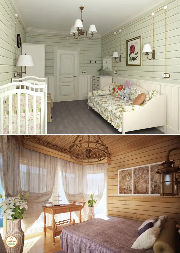 Довольно интересным решением будет облицовка каждой комнаты загородного дома при помощи вагонки разных расцветок.