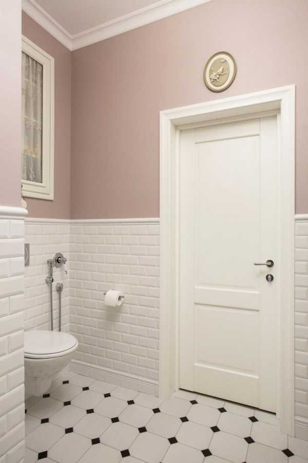 - Темный пол, дверь и плинтус белого цвета. Отличный вариант для маленького помещения с очень низким потолком. Необходимо не забывать, что в этом варианте нужно использовать только узкую окантовку пола. Зрительно пространство будет расширено.