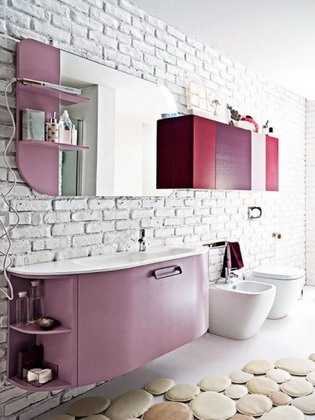 В ванных комнатах и туалетах кирпич также можно применять – никаких ограничений нет, материал выдерживает и повышенную температуру, и влажность. Кирпичной кладкой выделяют различные зоны в помещении, или разделяют их перегородками.