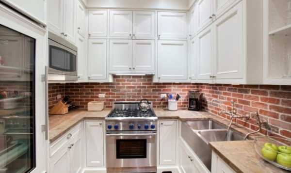 Чаще всего на кухне кирпичная кладка служит «фартуком» возле рабочей поверхности. Здесь применяют, как правило, декоративный кирпич, обладающий специальными характеристиками и гладкой поверхностью, что облегчает уборку.