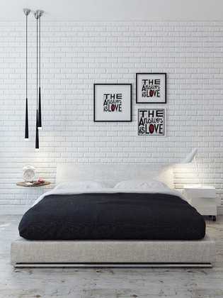 Кладка из белого кирпича или ее имитация в сочетании с текстилем сможет помочь создать в спальне спокойную романтическую атмосферу. Довольно часто нею оформляют стену у изголовья кровати, дополняя ее картинами, как показано на фото, оригинальными светильниками и прочими элементами декора. Стена под белый кирпич в интерьере спальни будет смотреться довольно эффектно, если грамотно подобрать яркий текстиль и контрастную мебель.