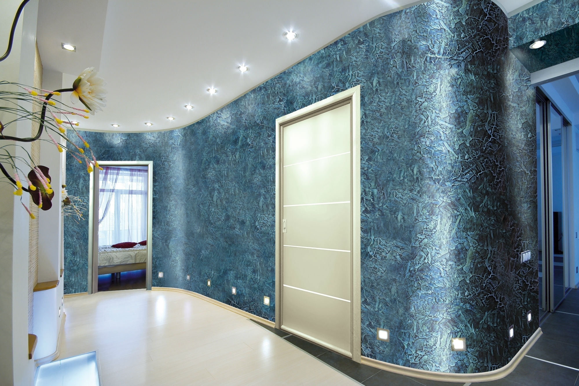 Жидкие обои простое и красивое решение для отделки коридора. Для маленького помещения стоит придерживаться светлой цветовой гаммы. Так же исправить ситуацию помогут зеркала в пол и яркое дневное освещение. Жидкие обои удобны для прихожей своей возможностью фрагментного ремонта.