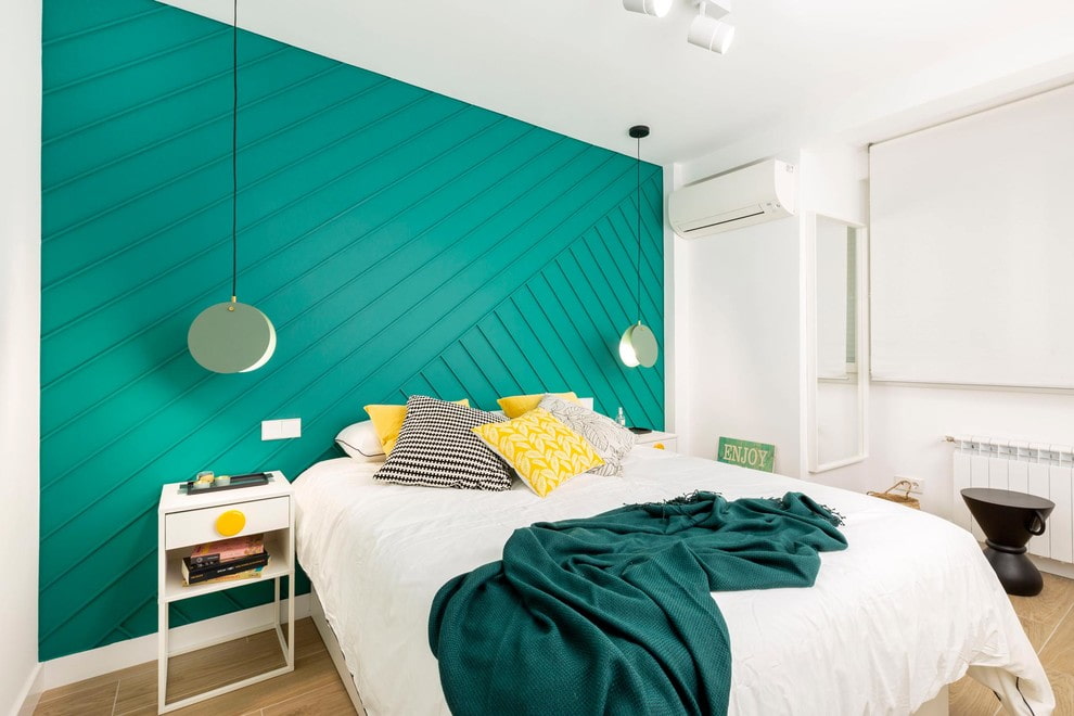 акцентная стена бирюзового цвета в интерьере спальни