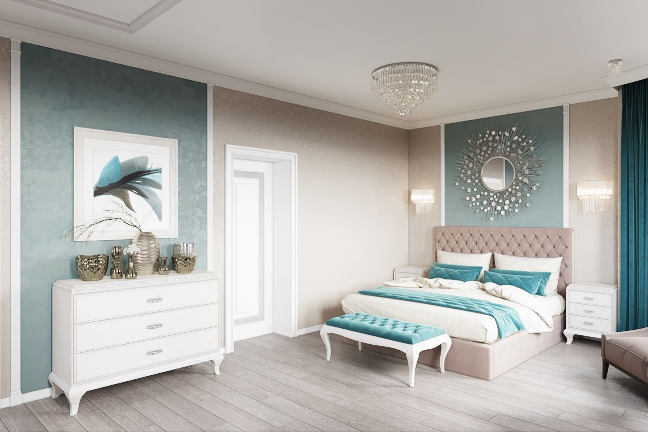 бирюзовая спальня в классическом стиле интерьера