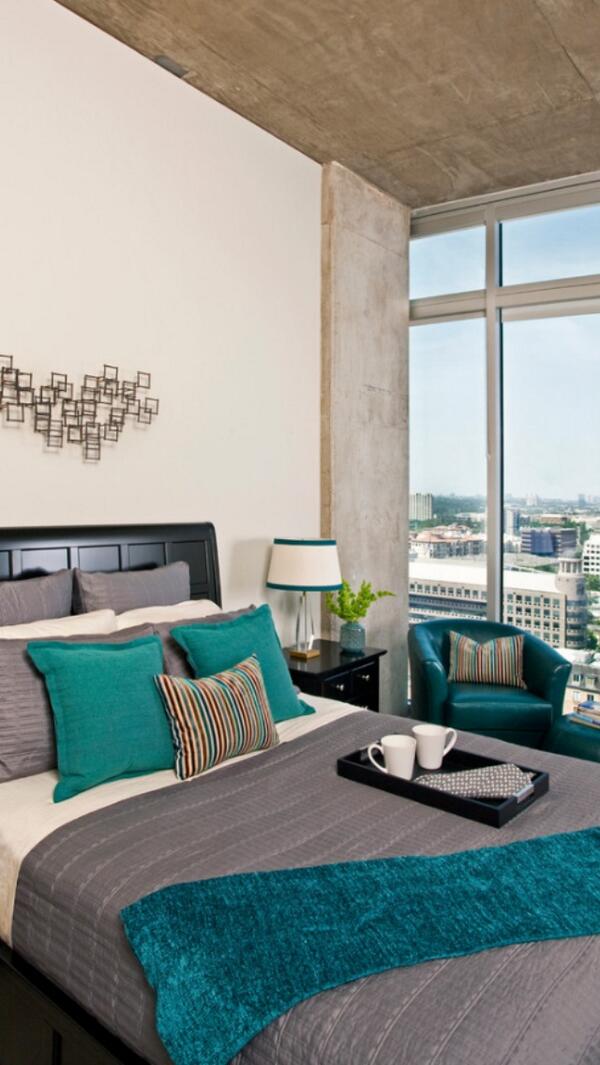 Бирюзовый цвет добавит яркости интерьеру серой спальни