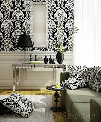 Фото 6. Черный цветочный узор на белом фоне обоев служит для визуального выделения гостиной зоны из остального помещения.