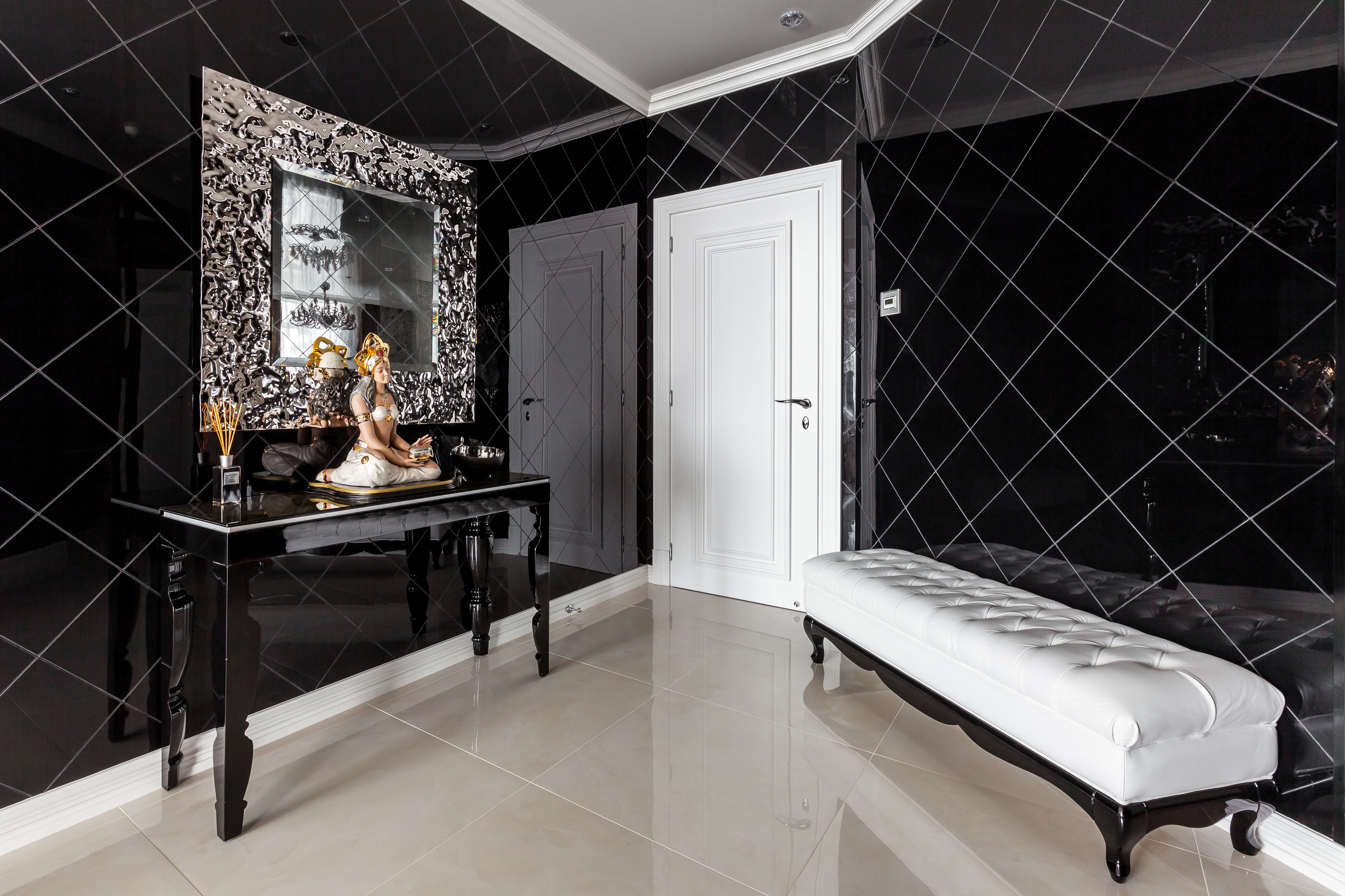 Если в старинных интерьерах чёрные стены были запрещены, то в современных неоклассических проектах, созданных на основе классических правил и элементов никаких запретов нет. Зачастую чёрный используется именно для того, чтобы подчеркнуть современную направленность дизайна и его стильность.