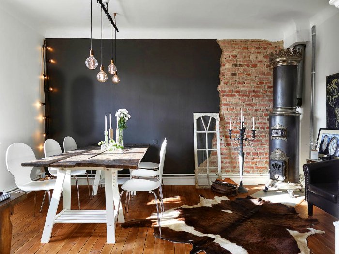 Ещё один из вариантов — кирпичная стена черного цвета. Она создает эффект фактурности. Такая стена больше подойдет для нежилой комнаты.