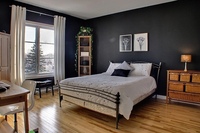 Черные стены и черная мебель в интерьере этой спальни контрастирует с белоснежным пастельным бельем.