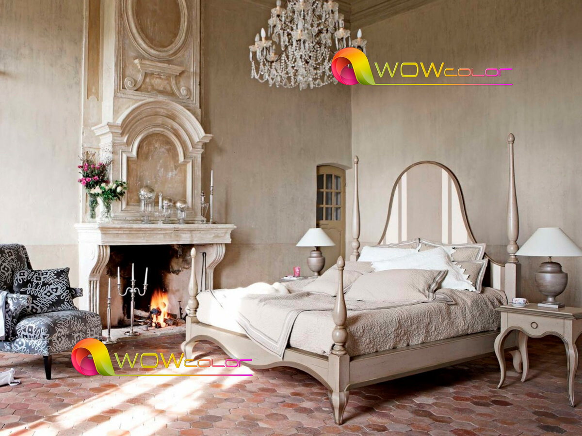 Характерная черта – использование сразу нескольких маленьких столиков в одной комнате. Декор стены – светлая штукатурка или обои в мелкий цветочек. Возможны вставки из «кирпича». Много светлых тканей, много кружева. Зеркала – большие и маленькие, в простых «золотых» рамах. Эффекты старения: «потертая краска» и «кракелюры». Кованые элементы декора. Терракотовые горшочки с растениями на подоконнике.