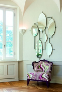 Зеркала тоже в свое время попали под «прицелы» цепких дизайнерских взоров, и стали воплощать самые необычные их фантазии. В эко стиле используют рамы из настоящих веток или частей стволов деревьев. В минимализме и хайтеке оригинальны сами поверхности зеркал: объемные, выпуклые, состоящие из множества граней. Для тех, кто хочет выделиться, подойдут композиции из «треснувших» кусков, которые в хаотичном беспорядке прикрепляют к стене. В подобной технике создаются «соты»: сочетания кусочков одинаковой формы (шестигранники) и размеров. Зеркало может быть частью художественной композиции, ее объемным элементом. К примеру, стену украшают огромным изображением головки одуванчика или «укропного» зонтика, а «парашюты» в нем выполнены из отражающих кусочков, круглой формы. Зеркальные поверхности используют для отделки кухонных фартуков, стен в гостиной и фасадов мебели.
