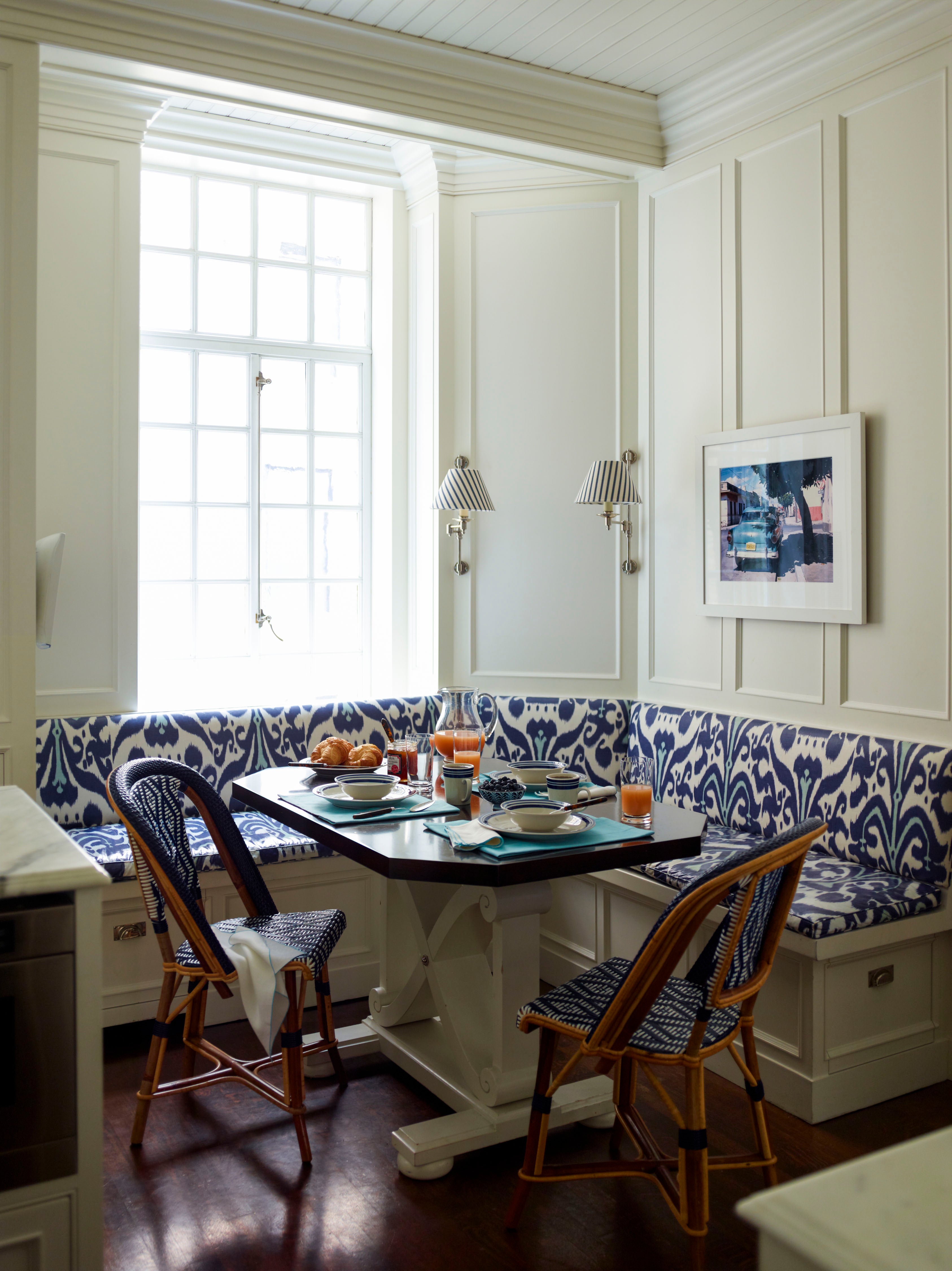 Диван идеально помещается между шкафами в кухонном уголке. через House Beautiful, февральский выпуск 2012 г.