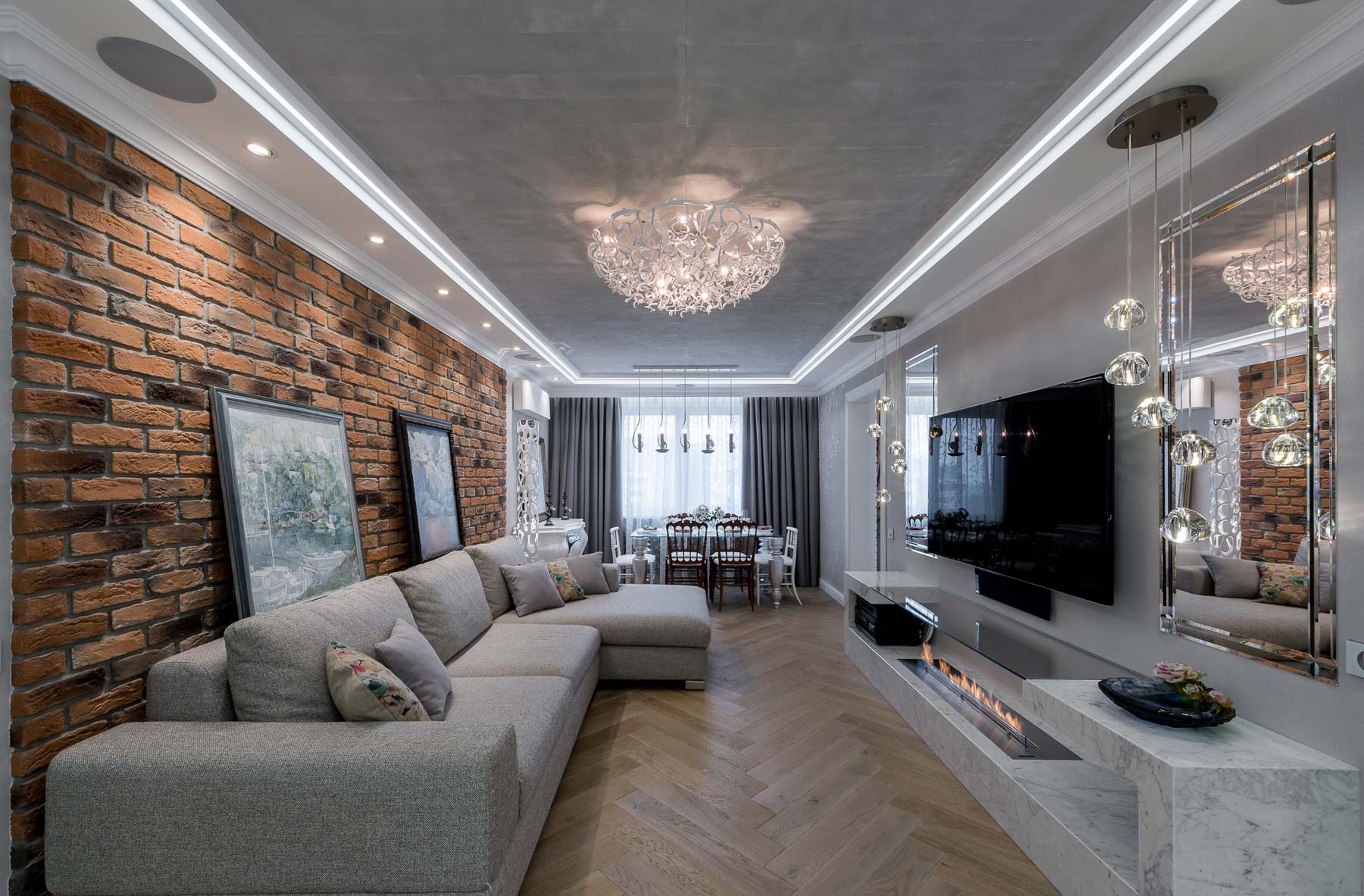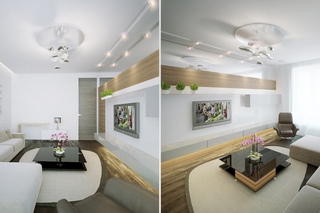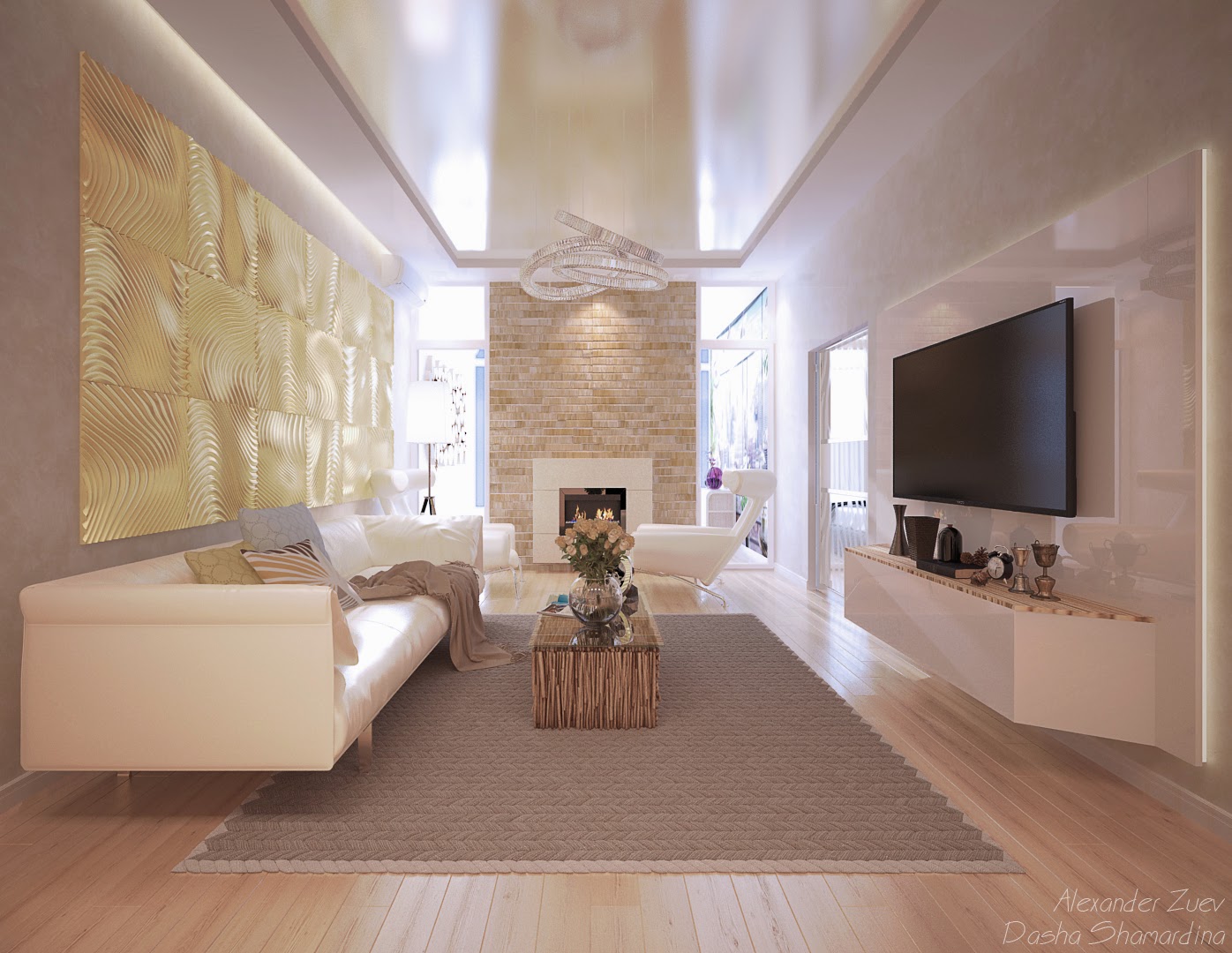 Добавление зеркал в конце комнаты также визуально ее расширят и придадут квадратную форму. Отделывать гостиную следует начинать с потолочной части, предварительно выровняв и зачистив поверхность. После чистки потолка его покрывают латексной белой краской. Стены можно также покрыть краской или поклеить обоями, содержащими орнамент или неброский рисунок. Цвета должны отличаться от предметов мебели, не иметь пестрых оттенков и едких цветов.