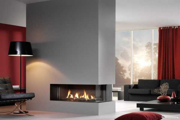 Трехсторонний камин желательно обустроить так, чтобы использовать его с максимальной эффективностью. Все выступающие части стоит оформить под полки, на которые удобно выставить предметы декора. Камин в интерьере небольшой комнаты должен занять угловое пространство. Вовлечение в процесс декорирования пассивных частей стен поспособствует визуальному расширению комнатного пространства и наполнит его легкостью.