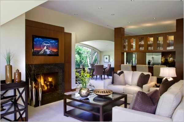 В большинстве гостиных телевизор – неотъемлемая часть жизни. В таком случае стоит разделить пространство в комнате на зоны. Например, камин расположить на другой стороне или стене комнаты, отделив эту зону журнальным столиком и одним или двумя креслами, поставив вазу с цветами. Допускается сочетание камин-телевизор, когда камин располагается под телевизором.
