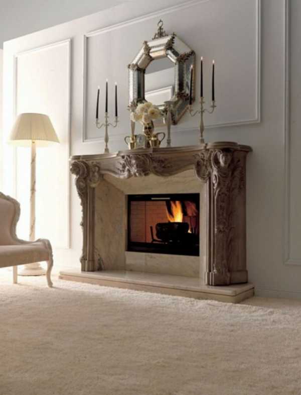 Пышно декорированные узорами флорентийской мозаики и резьбой камины в духе барокко или ампир, выглядят очень помпезно. Они станут желанными гостями в таких же по-царски с размахом оформленных залах.
