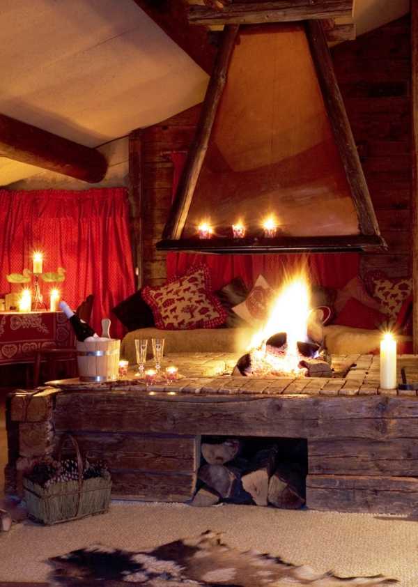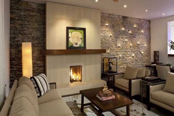 Поскольку доминирующим источником светоизлучения в интерьере с камином в квартире должен оставаться очаг, то использования яркого дополнительного освещения становится неуместным. Свет люстры например, напрочь убьет весь уют в атмосфере комнаты.