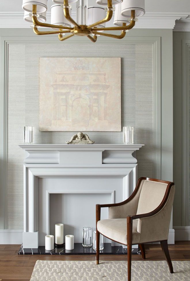 В светлой комнате, где классика сочетается с современностью, камин станет настоящим украшением интерьера. Деревянные панели, светлые пол и потолок и такая же мебель отлично сочетаются с мраморным серо-белым камином.