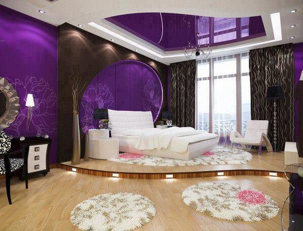 Для взрослых спален устанавливать сиреневый потолок можно как в насыщенных, так и в размытых оттенках, создавая настроение умиротворения и заряжая энергией.Интересно на более спокойные по тону стены нанести контрастный рисунок или узор, например, взять, ярко-фиолетовый, желтый или красный на холодном бежевом или сером фоне. Можно использовать данные расцветки в текстиле или предметах интерьера, подчеркивая игривость.