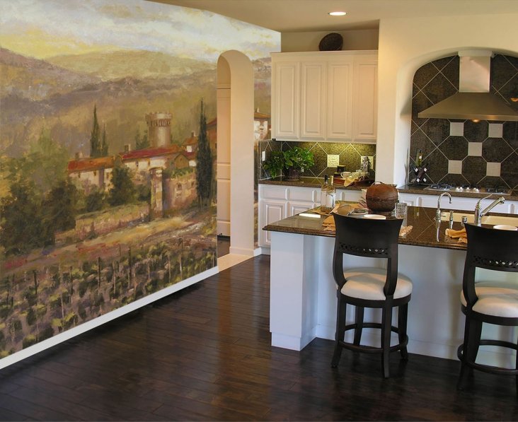 Кухня. Фрески на стену на кухне лучше размещать в обеденной зоне. Для кухни будут актуальны натюрморты, композиции из цветов, пейзажи города. Следите за соответствием картинки на фреске и общим интерьером.