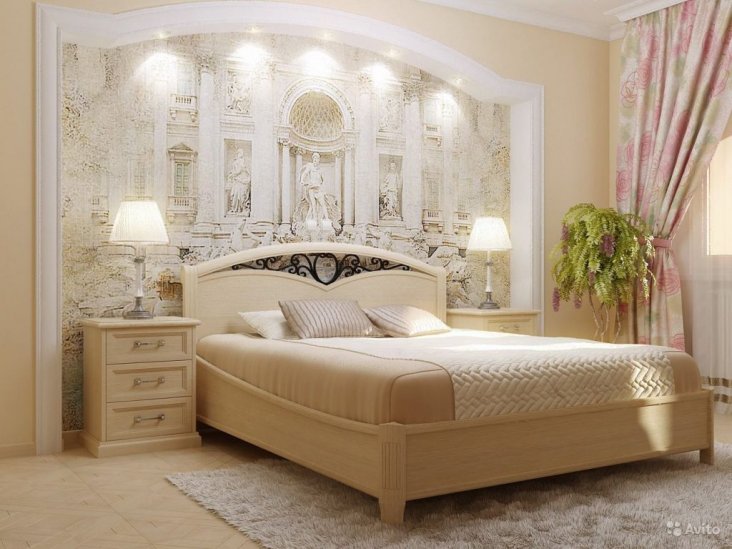 В спальне должна царить обстановка умиротворенности, поэтому не стоит рассматривать варианты с портретами или изображениями мегаполисов. Лучше остановить выбор на пейзажных фресках на стенах, классических сюжетах из античной истории.