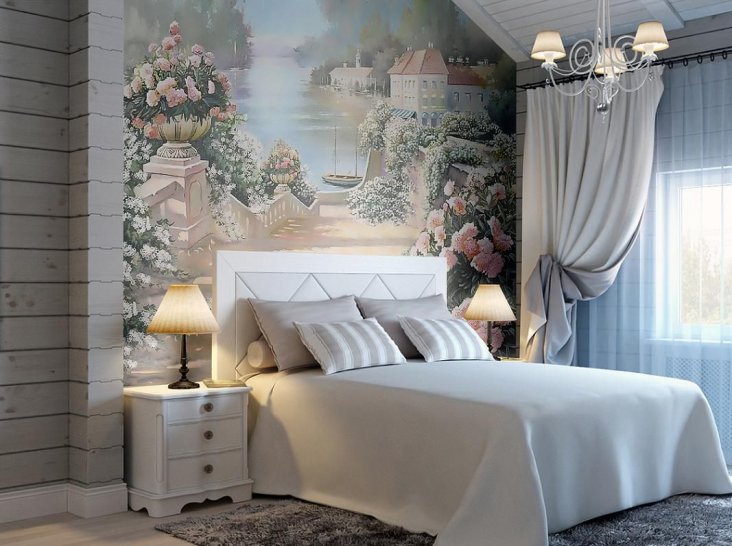 Спальня. Подходящее место для размещения фрески — изголовье спального места. В комнате отдыха лучше использовать спокойные, пастельные оттенки.