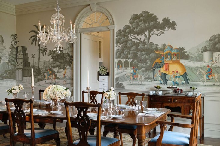 На фото интерьер с тематической фреской из быта эпохи Средневековья, которая занимает две стены просторной столовой в классическом стиле.