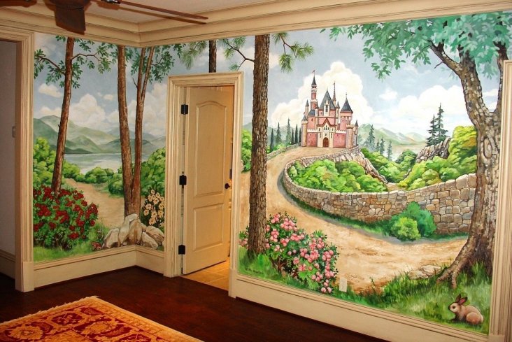 Детская. Предоставьте своему малышу возможность созерцать настенную фреску. Отличный вариант для детской комнаты- сказочные сюжеты.
