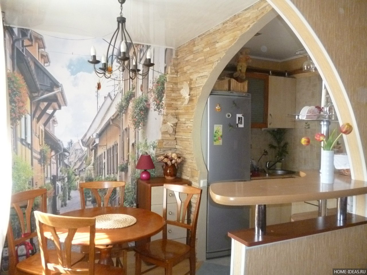 Можно визуально «продолжить» помещение застекленной верандой или широким балконом. Античные террасы с колоннами идеально вписываются в классические интерьеры. Современные варианты могут как имитировать вид на современный город, море или горы с лоджии, так и создавать футуристические картины дополнительных комнат и тоннелей. Особенно эффектно будет смотреться такое полотно, если напольное покрытие, изображенное на нем, будет совпадать по цвету с реальным полом вашей кухни.