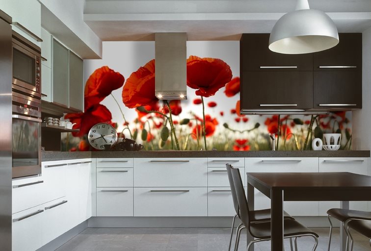 - Красота. Даже самую невыразительную кухню можно преобразить с помощью эффектного изображения. Высокое компьютерное разрешение позволяет современным производителям создавать безупречно четкие картинки во всем многообразии оттенков.