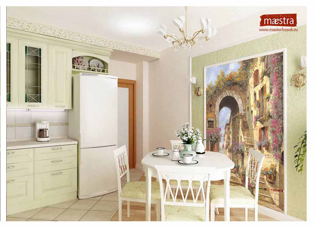 Многие из таких вариантов позволяют не просто полюбоваться на красоты, но и создать ощущение того, что кухня плавно перетекает в место, изображенное на полотне.