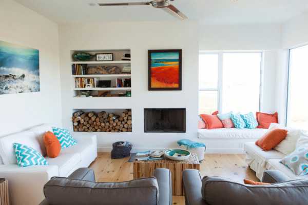 Однако, можно поиграть с летними ассоциациями, чтобы создать атмосферу уютного пляжного домика или летней виллы. Для этого стоит выбрать очень бледный оттенок голубого цвета и сохранять минимальную обстановку, в которой будут присутствовать лишь один или два ярких пятна оранжевого.