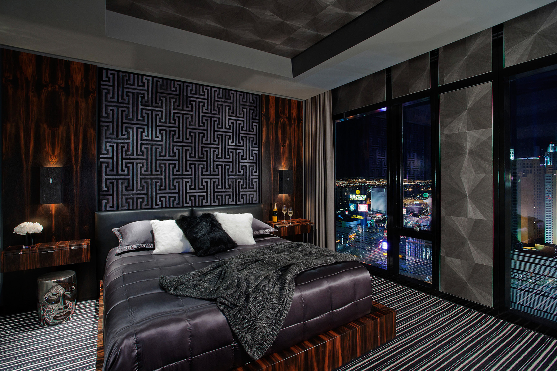 Пол и потолок многоуровневые, потолок — из гипсокартона и глянцевого полотна, пол с узорчатым орнаментом, покрытый ковром из шкуры леопарда, тигра или зебры.