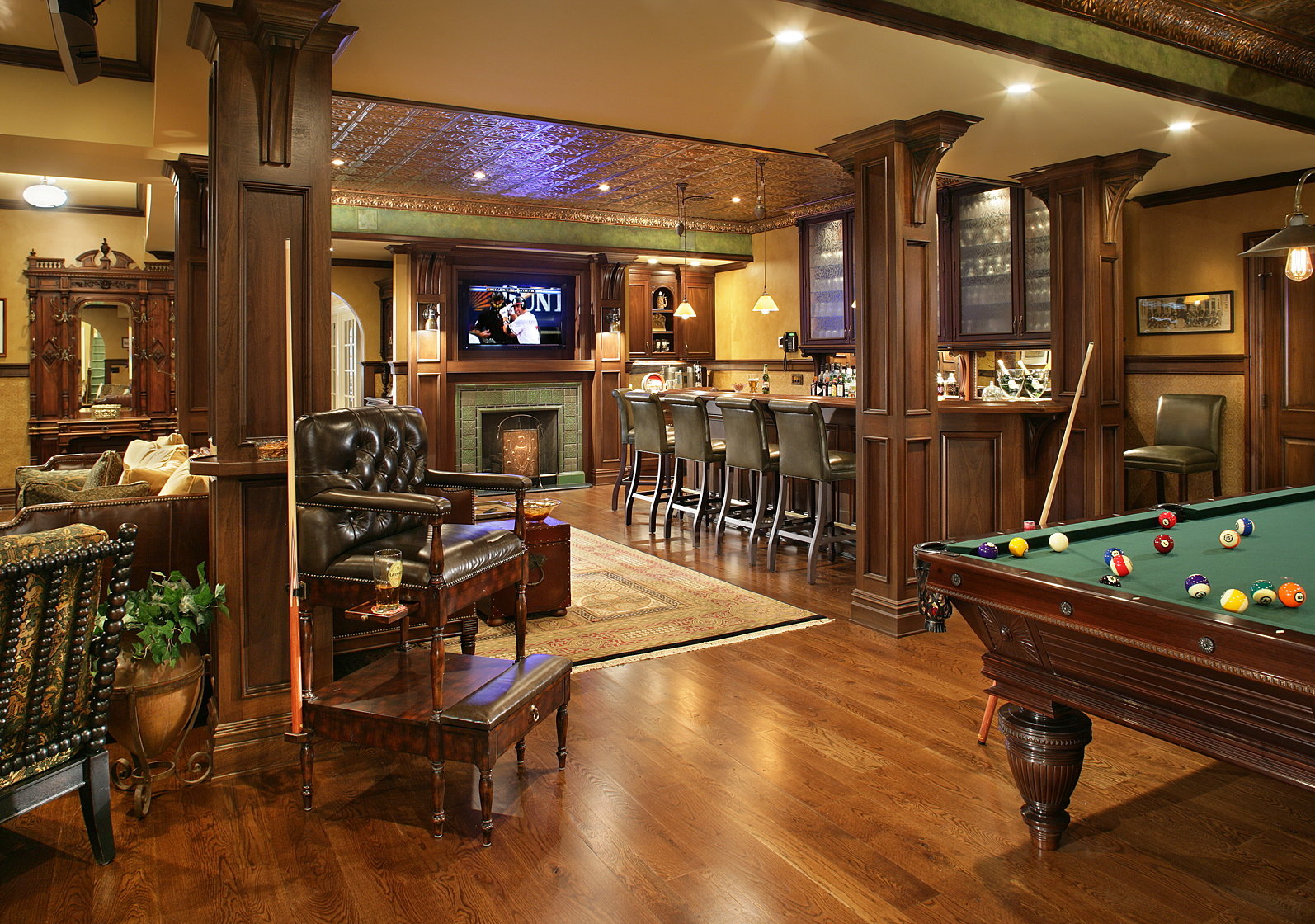 - В центре комнаты поставьте бильярдный стол (не забудьте о дополнительном освещении для него).