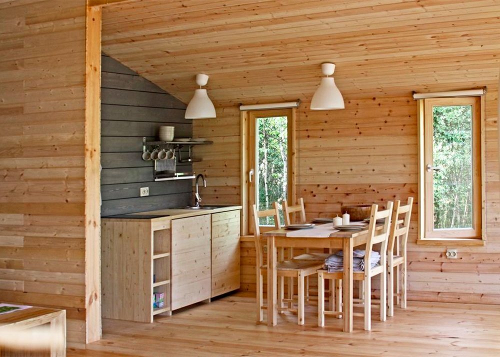 Отделка вагонкой, которая является одной из самых простых, создаст теплую и уютную атмосферу в доме. Лучше всего использовать только ту мебель, которая действительно необходима: обеденную группу, диван или кровать, необходимые элементы кухни. Чтобы украсить комнату, можно повесить картину, зеркало или просто поставить цветы в горшках.