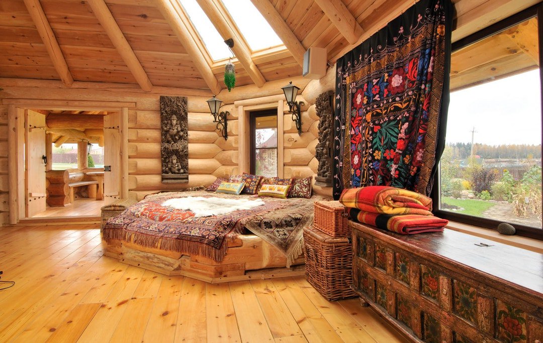 Оно хорошо глушит шум и приятное для босых ног. Такое решение дополнит интерьер спальни в деревянном доме.