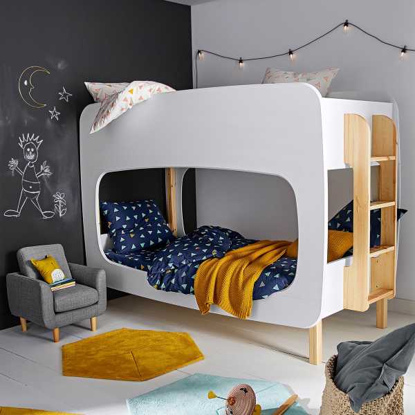 - На случай, если пространство комнаты не позволяет рационально распределить все зоны, поставьте двухэтажную кровать, заранее договорившись с детьми, кто на каком ярусе будет спать. Различие подчеркните при помощи рисунков на стенах или с помощью разных расцветок постельных принадлежностей, например, более темные – для мальчика, светлые – для девочки. Если дети маленькие и примерно одного возраста продумайте вариант с двухъярусной кроватью с дополнительными игровыми элементами, это может сблизить интересы брата и сестры.