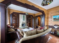 Теплая гостиная в деревянном доме Гостиная в современном стиле с большим эркеромКухни и столовые