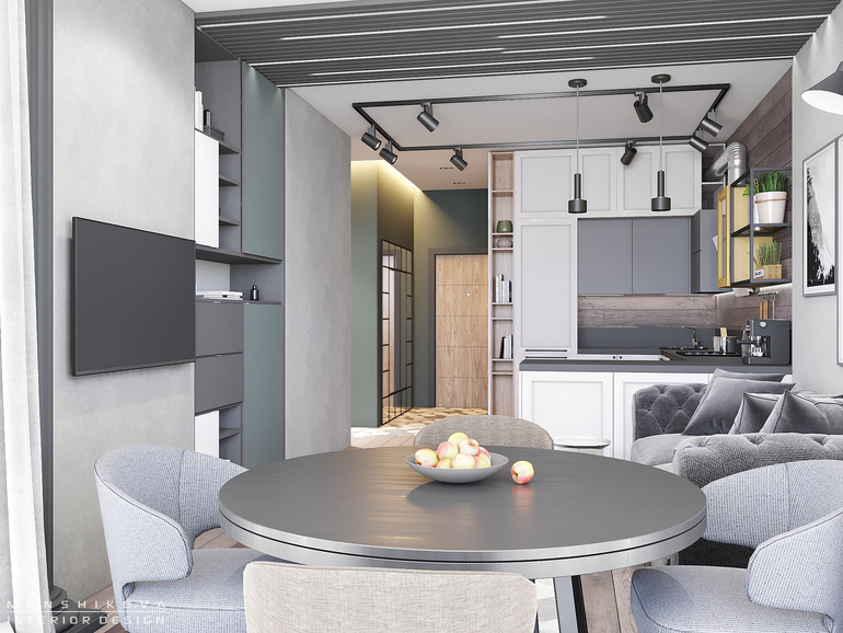 Кухонная и обеденная зона объединены единой столешницей. Проведено зонирование при помощи напольного покрытия. Есть места для хранения как в прихожей, так и в гостиной.