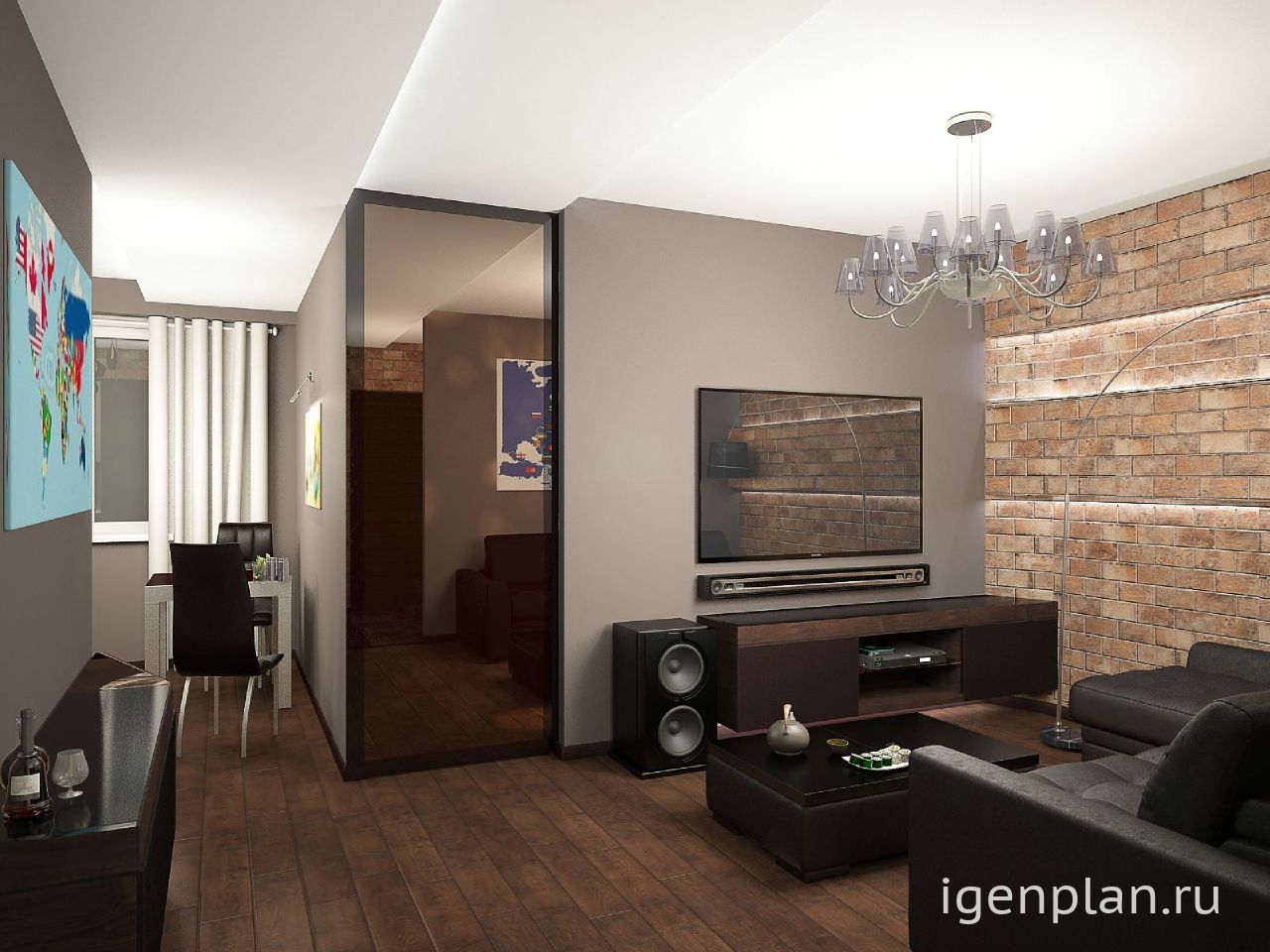 В более практичном варианте комнату лучше оформлять как единую зону отдыха, без делений и зонирования.