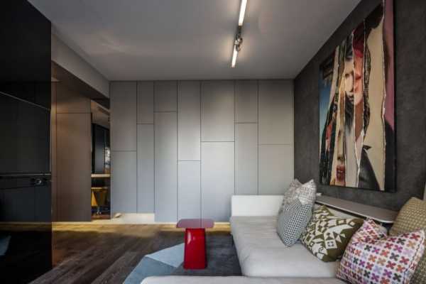 Так же есть варианты шкафов с раскладывающейся из них кровати. Когда она не нужна она просто трансформируется в шкаф (поднимается). Единственный минус ее в том, что такой шкаф выглядит громоздко, и занимает достаточно много места. Поэтому предпочтительнее первый вариант. Место для зоны гостиной и спальни лучше отвести ближе к окну.Так как спальная будет находиться в тупике, выше вероятность что сон спящего не будет потревожен.